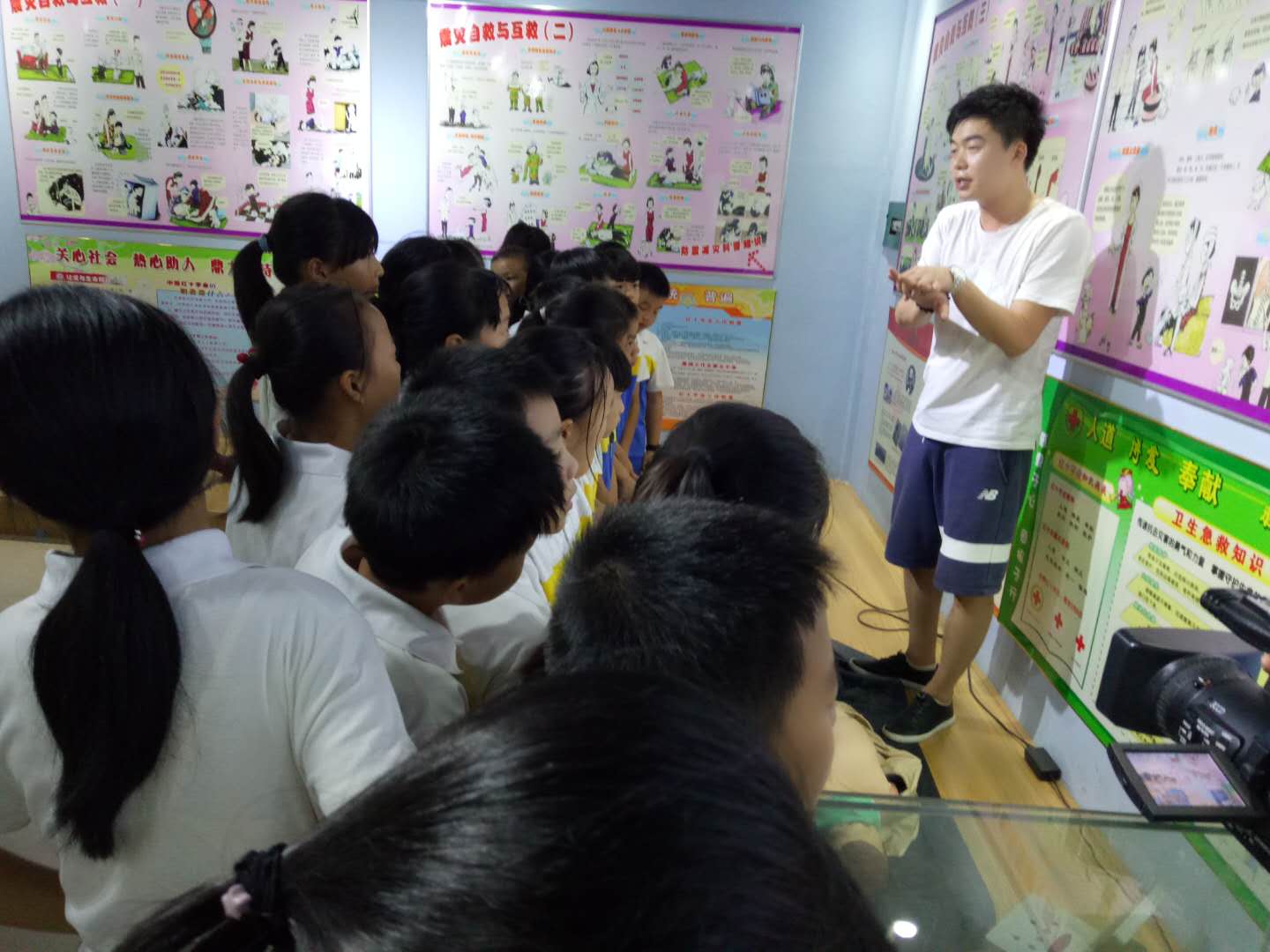 在丰城市青少年校外活动中心科普体验馆学生们认真听老师讲解”心肺复苏”
